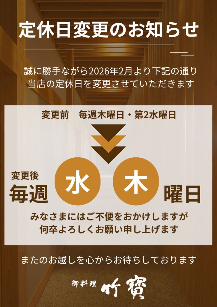この度、誠に勝手ながら下記の通り定休日を変更させていただきます。